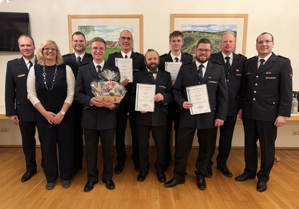 Von links: Christian Sawall stellv. Kommandant, Diana Armbruster stellv. des Ortsvorstehers, Sven Dieterle neu in den Ausschuss gewählt, Kai Heinzelmann verabschiedet, Pascal Brendel befördert zum Feuerwehrmann, René Kern befördert zum Feuerwehrmann, Jannik Pohl befördert zum Feuerwehrmann, Philipp Dieterle befördert zum Löschmeister, Uli Armbruster Kommandant Abteilung Schömberg, Andreas Eberhardt Gesamtkommandant Loßburg